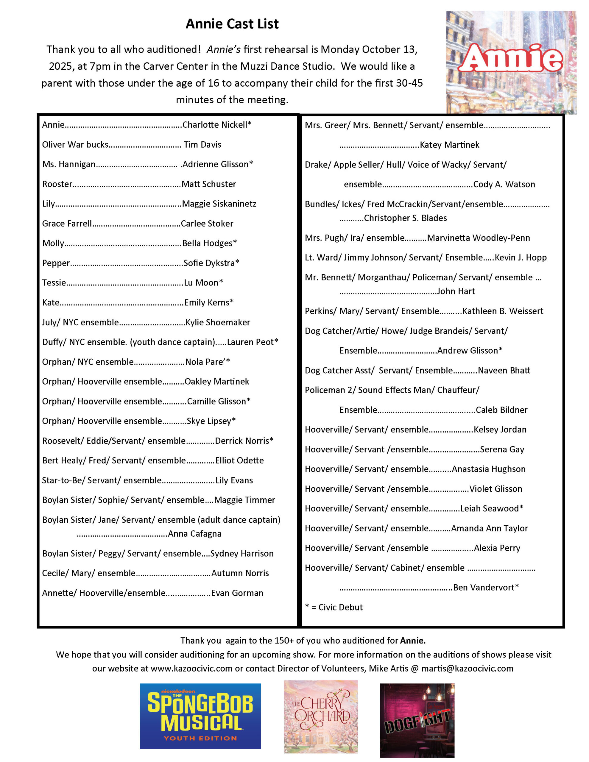 The Civic is committed to inclusiveness and practices open and non-traditional casting. All roles in Civic productions, unless otherwise announced, are open to all who audition. The Civic goal is to foster and develop theatrical talent in our community and encourage anyone, regardless of experience, to audition for our productions.